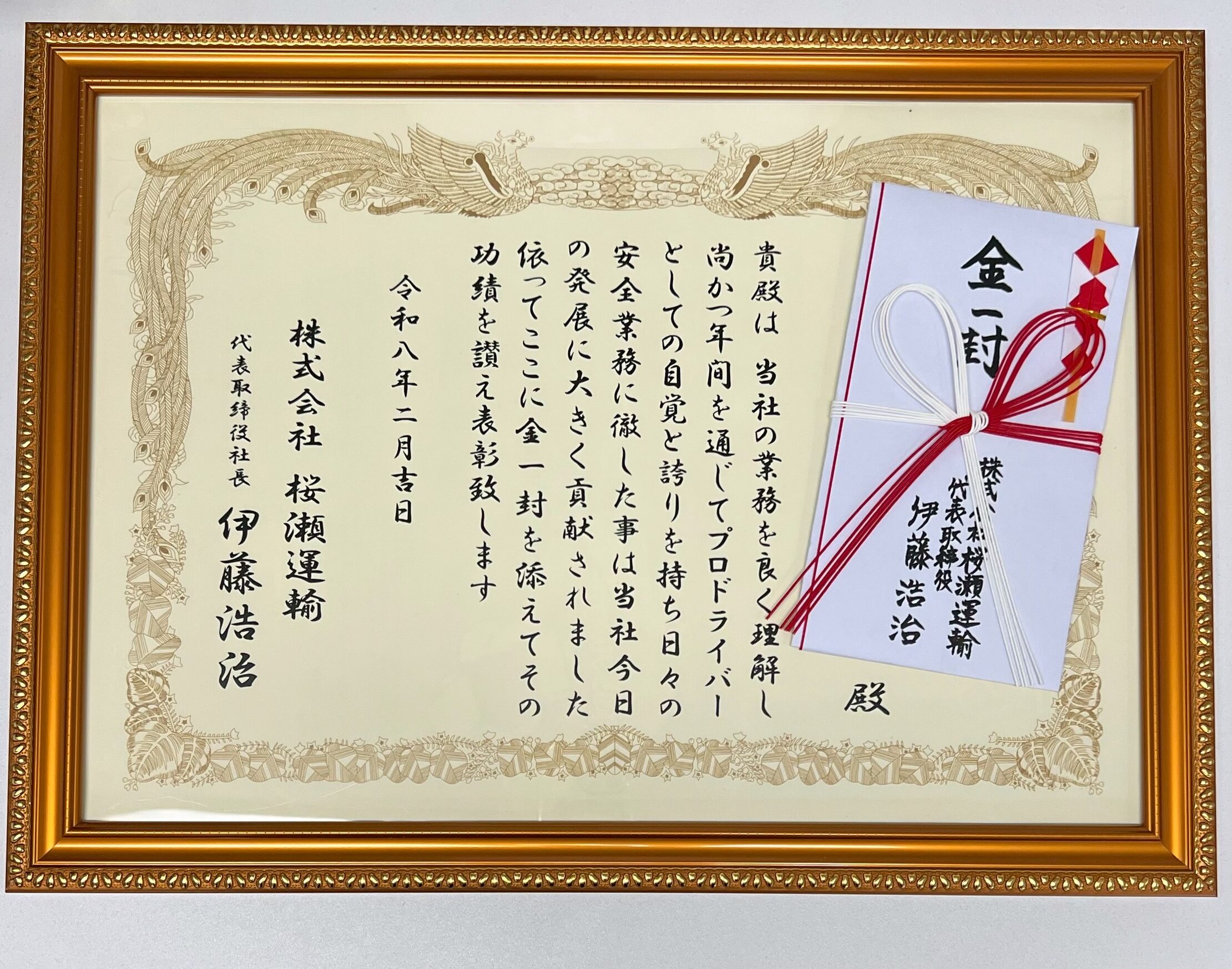 安全運転を心がけ、1年間無事故を達成した従業員の功績を讃え表彰致します。